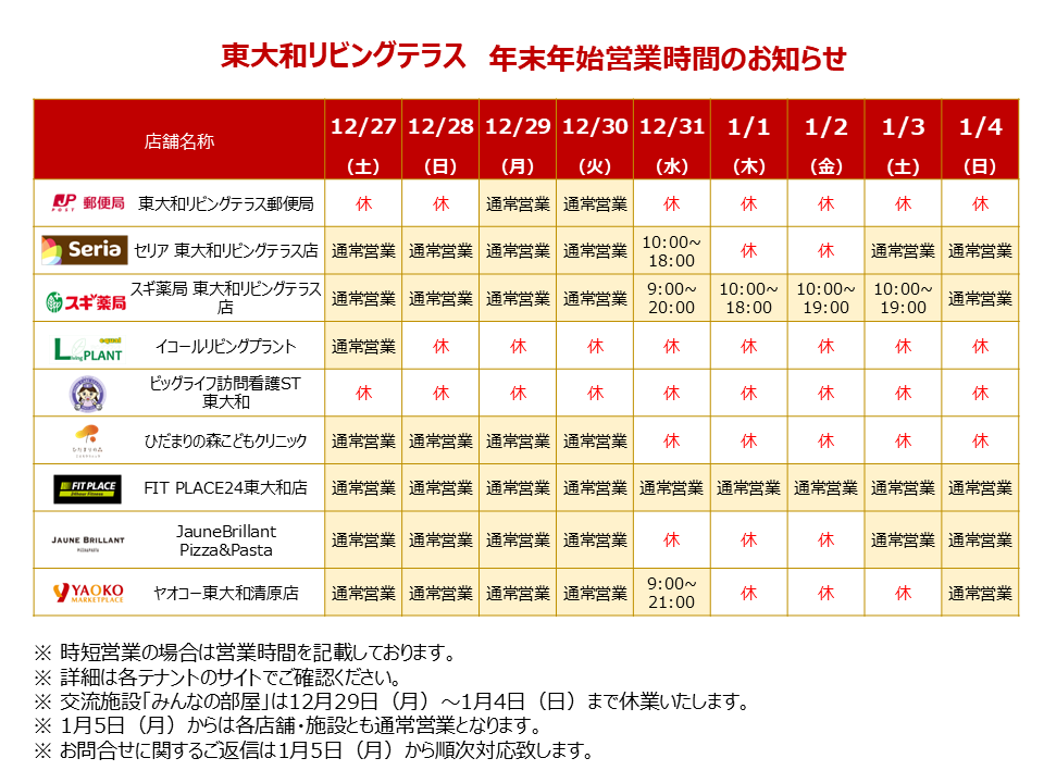 東大和リビングテラス 年末年始営業時間のお知らせ